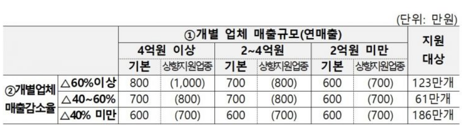 ▶ 업체의 매출 규모, 매출 감소율 감안하여 차등 지급